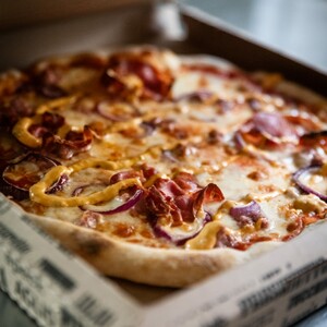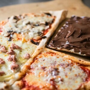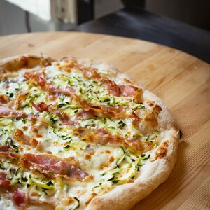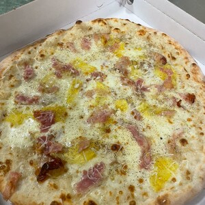 Besciamella, provola affumicata, speck, mozzarella, ananas, pancetta, pecorino romano e pepe,