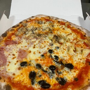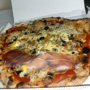 Pomodoro funghi, carciofi, olive, prosciutto cotto e mozzarella